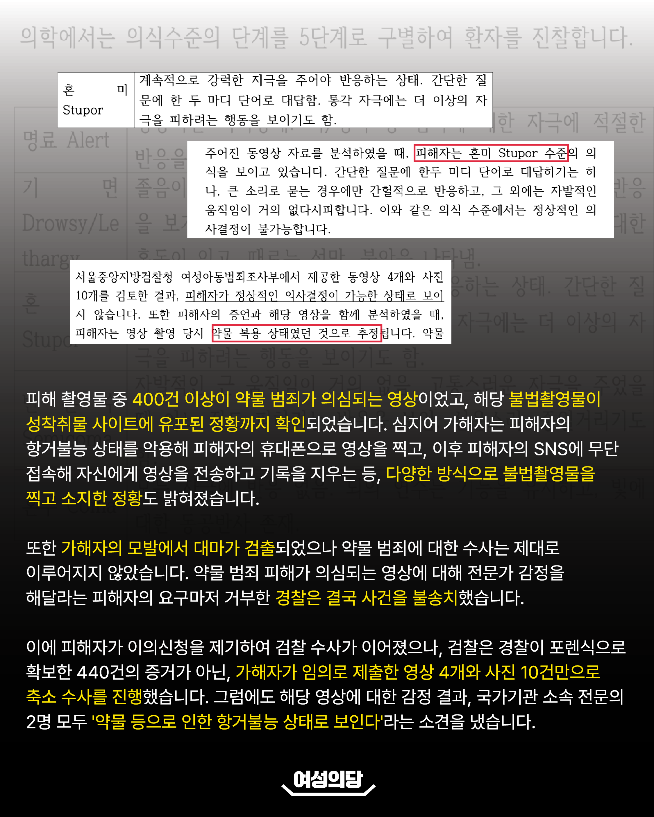 2020년, 한 여성이 결혼을 약속했던 남자친구에게 약물 성범죄를 당했습니다. 남자친구의 휴대폰에는 440건의 불법촬영물이 담겨 있었습니다. 영상과 사진에는 피해자의 얼굴과 이름, 신체 부위가 적나라하게 드러났고 가해자는 피해자의 얼굴을 짓누르며 "일베 포즈"를 취했습니다. 심지어 불법촬영물을 각종 SNS와 성착취물이 유포되는 도박 사이트에 유포했습니다. 그러나 경찰은 6개월이 지나도록 압수수색마저 제대로 진행하지 않았습니다.